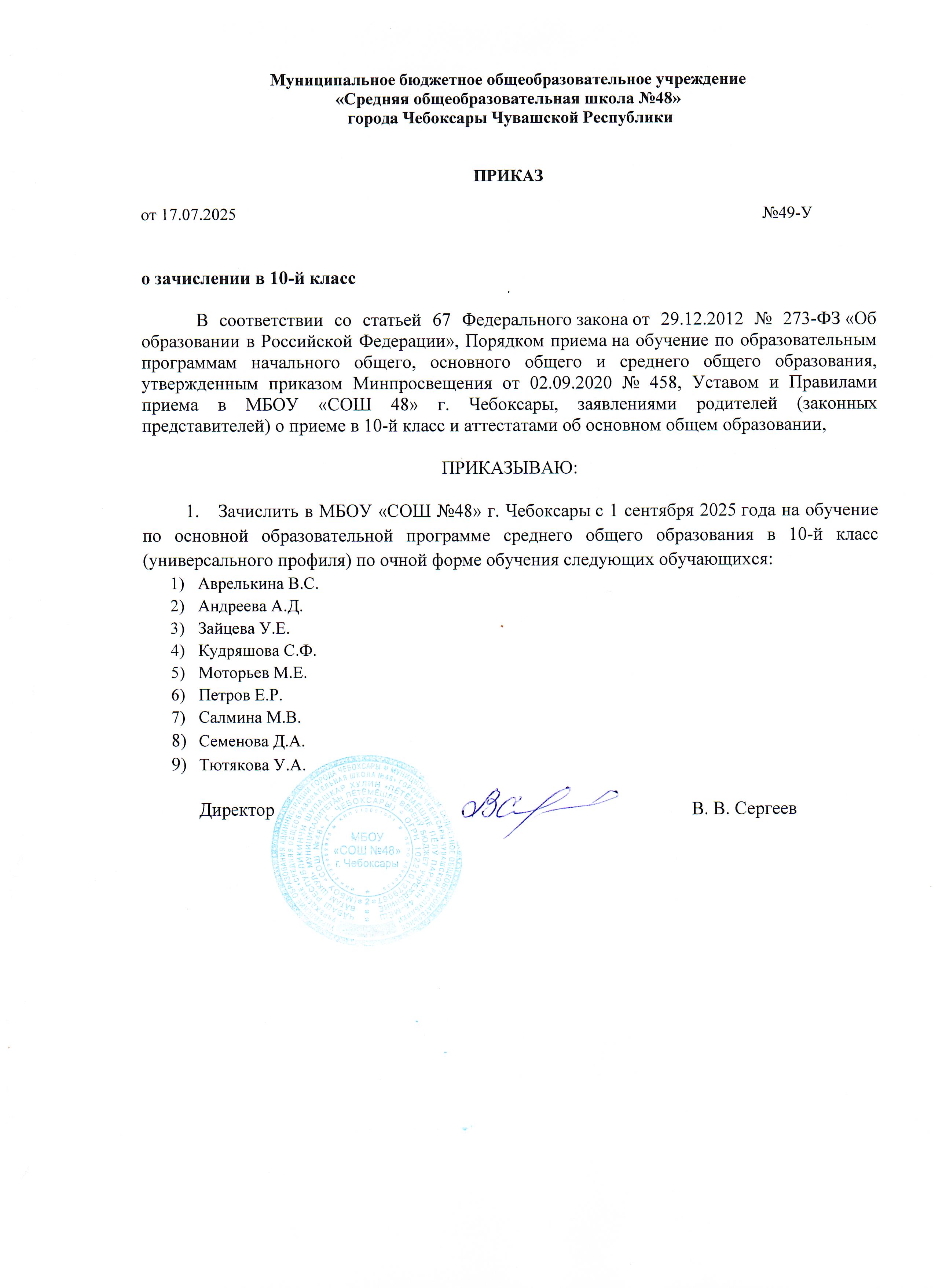 Приказ от 17.07.2025 №49-У "О зачислении в 10 класс" >>